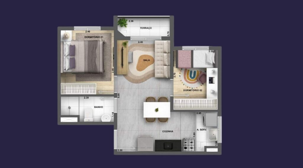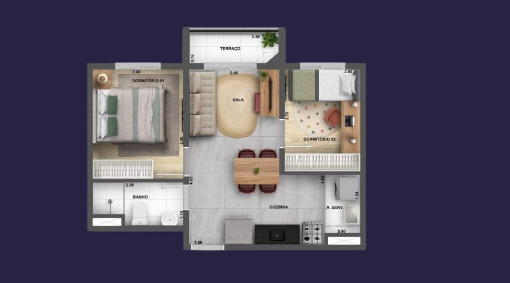 Apartamentos com 1 e 2 dormitórios com opção de terraço.