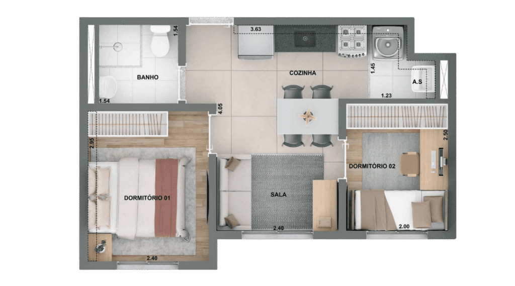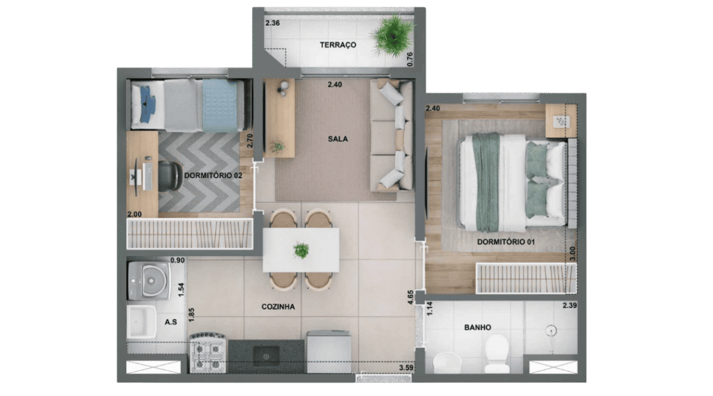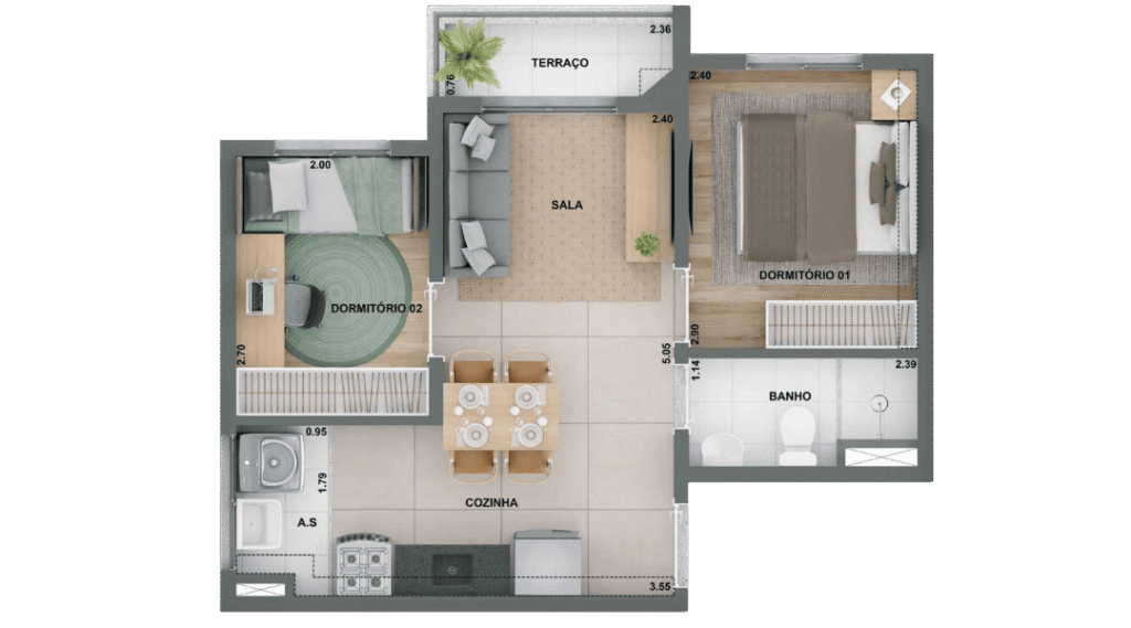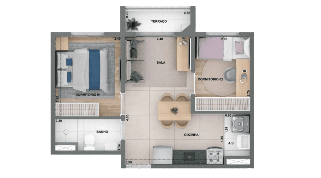 2 Dorms. com terraço 36,80 m²